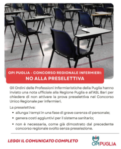 Alla luce di quanto esposto, gli OPI della Puglia ritengono che l’attivazione di una prova preselettiva non risponda ad alcuna reale esigenza di interesse pubblico, ma al contrario rischi di compromettere l’efficacia, la tempestività e la sostenibilità dell’azione amministrativa, in un momento storico in cui il sistema sanitario regionale necessita di risposte immediate e strutturali mortificando la professione infermieristica che si ricorda essere una professione abilitata dallo Stato